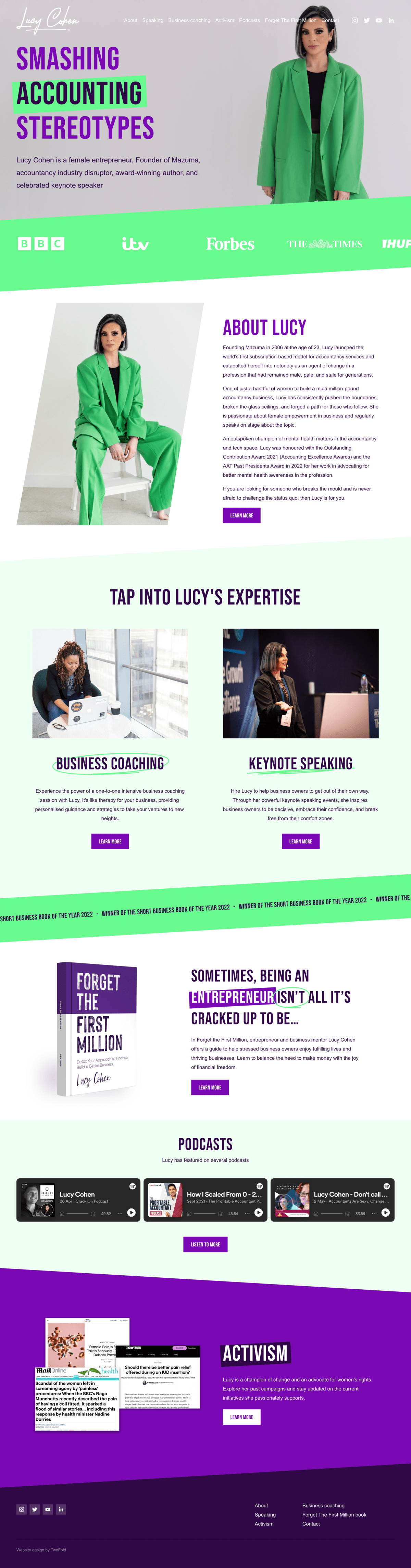 Lucy Cohen is a prominent figure in the accounting world. She’s rebellious, a punk, a disruptor, and her website needed to reflect that as her current Squarespace did not. As the Founder of accounting firm Mazuma, the website needed a nod in the direction with the colour scheme whilst crafting a brand that was uniquely Lucy’s.
